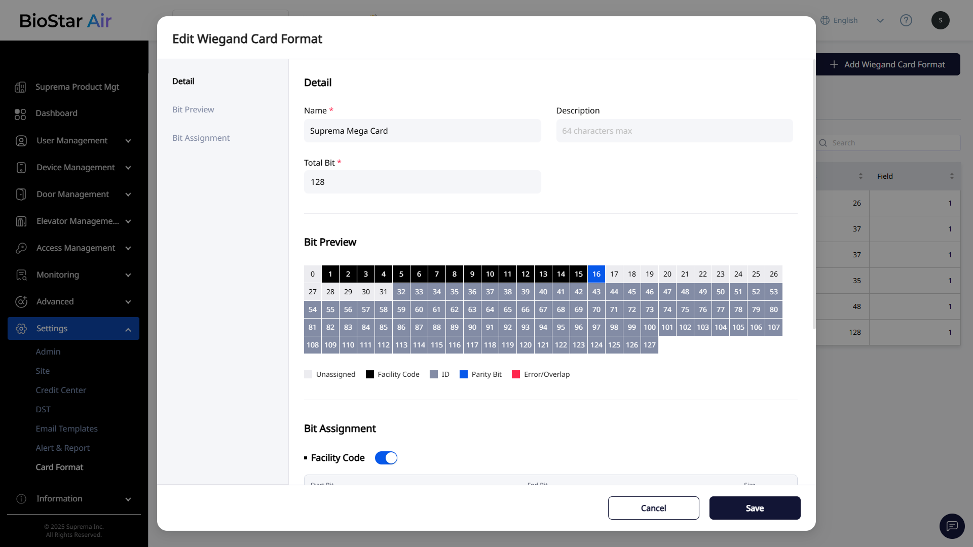 Add Wiegand Card Format 창이 나타나면 Detail 섹션에서 이름 및 설명(선택 사항), 총 비트를 입력하세요.