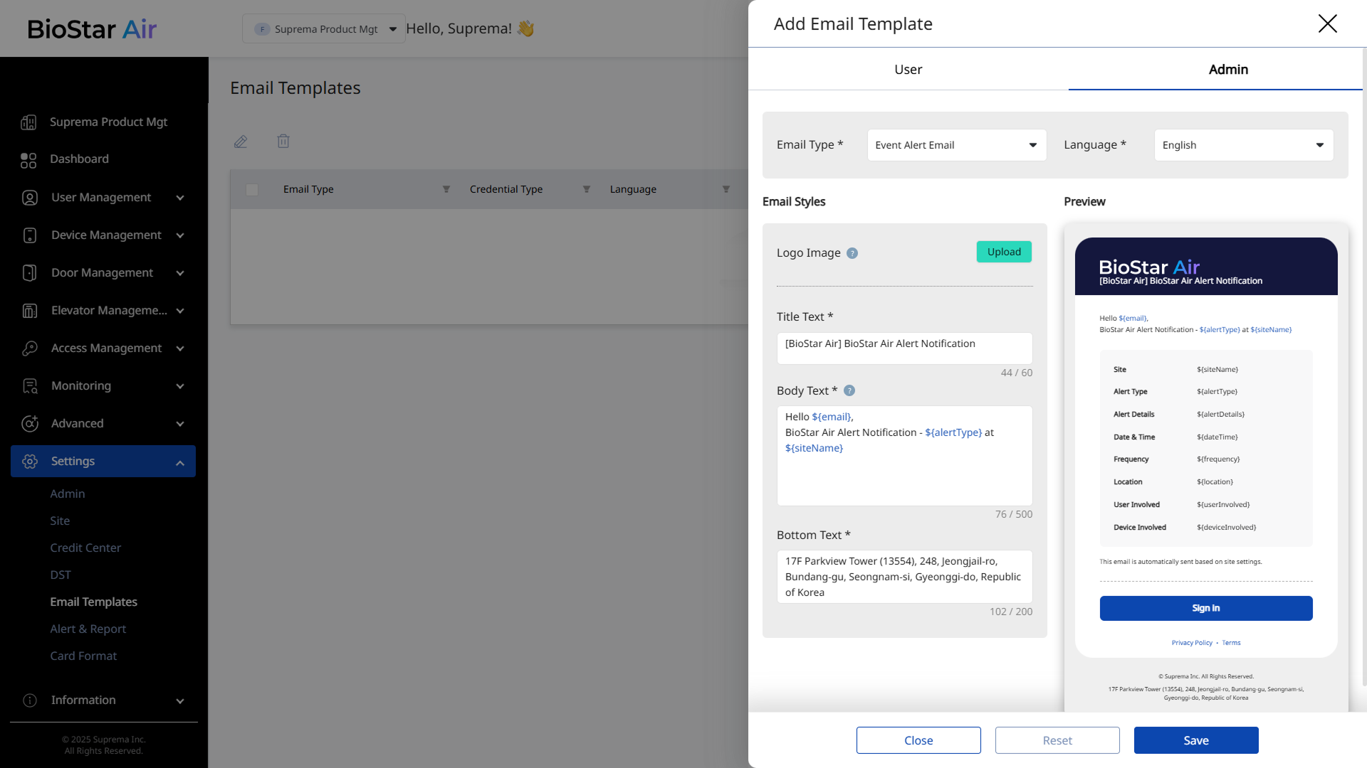 BioStar Air의 이메일 템플릿 기능을 사용하면 사이트 사용자에게 전송되는 이메일을 사용자 정의하여 회사의 브랜드와 메시지를 반영할 수 있습니다. 이메일 템플릿에는 초대장, 활성화 이메일 및 기타 알림 등이 포함됩니다.