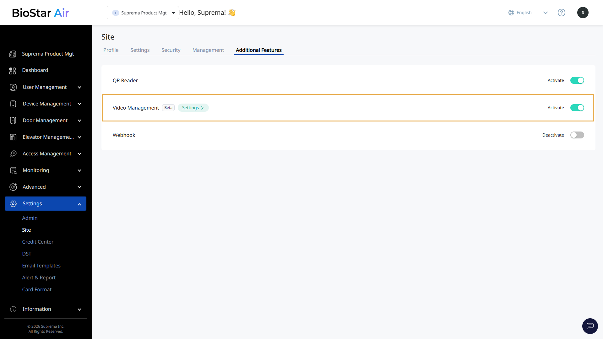 마스터 관리자만 비디오 관리 활성화와 같은 사이트 설정을 변경할 수 있습니다. BioStar Air 포털에 마스터 권한으로 로그인하세요.