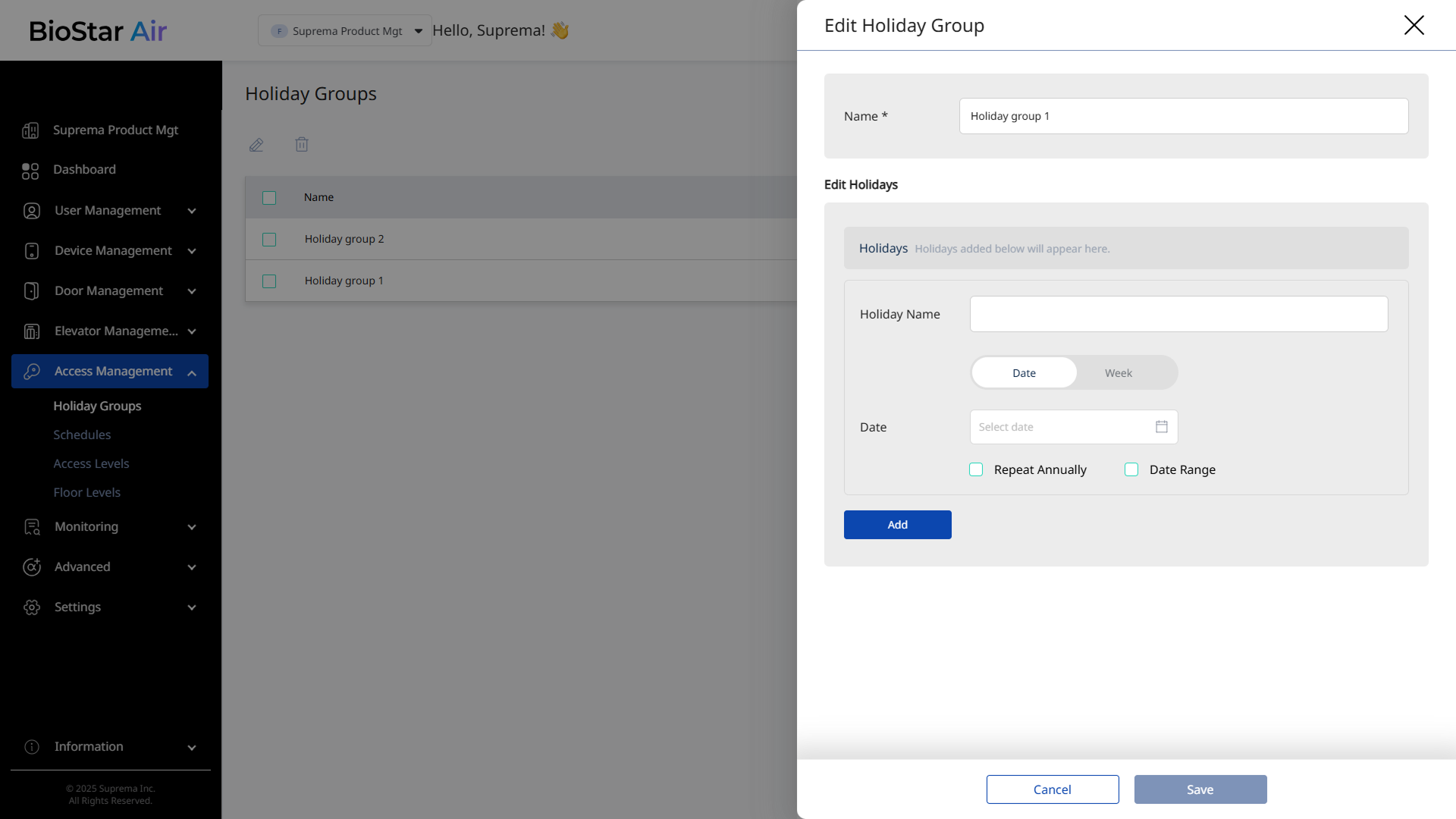 BioStar Air에서 휴일 그룹은 특정 날짜나 기간 동안 출입 규칙을 조정하는 데 사용됩니다. 휴일 그룹을 설정하면 관리자는 공휴일이나 특별한 날에 출입 권한을 제한하거나 변경할 수 있습니다. 이를 통해 보안 수준을 유지하면서도 유연한 출입 통제를 구현할 수 있습니다.