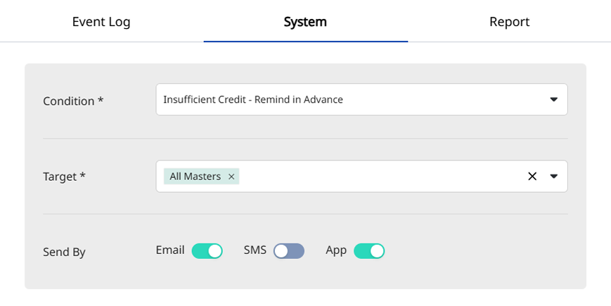System 탭에서 시스템 상태에 따라 알림 발생 조건을 설정할 수 있습니다.선택할 수 있는 옵션은 다음과 같습니다.