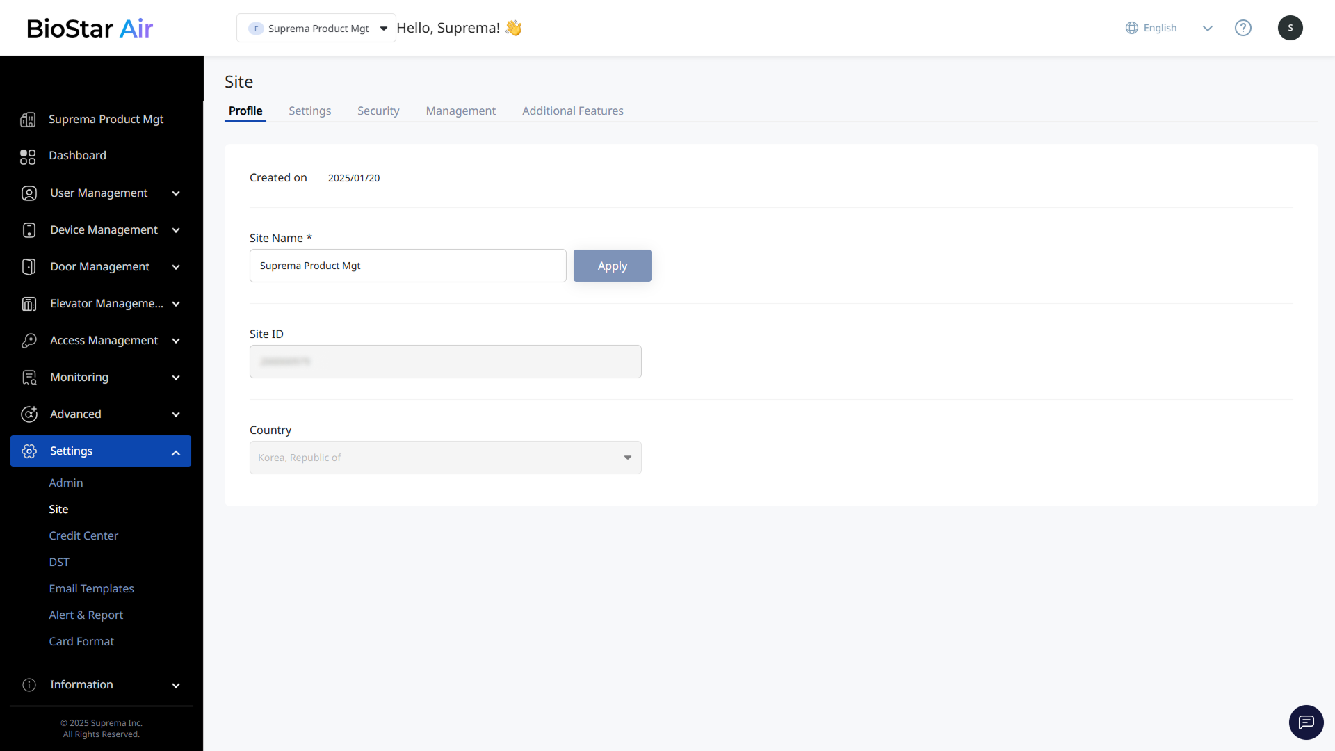 Country: 사이트 생성 시 설정되며 나중에 변경할 수 없습니다. 변경이 필요하면 BioStar Air 파트너 포털을 통해 진행해야 합니다.