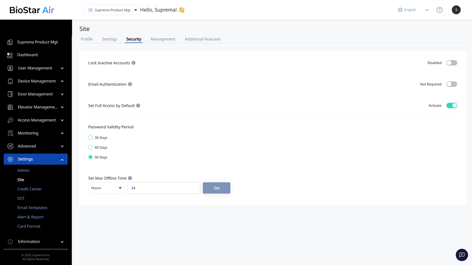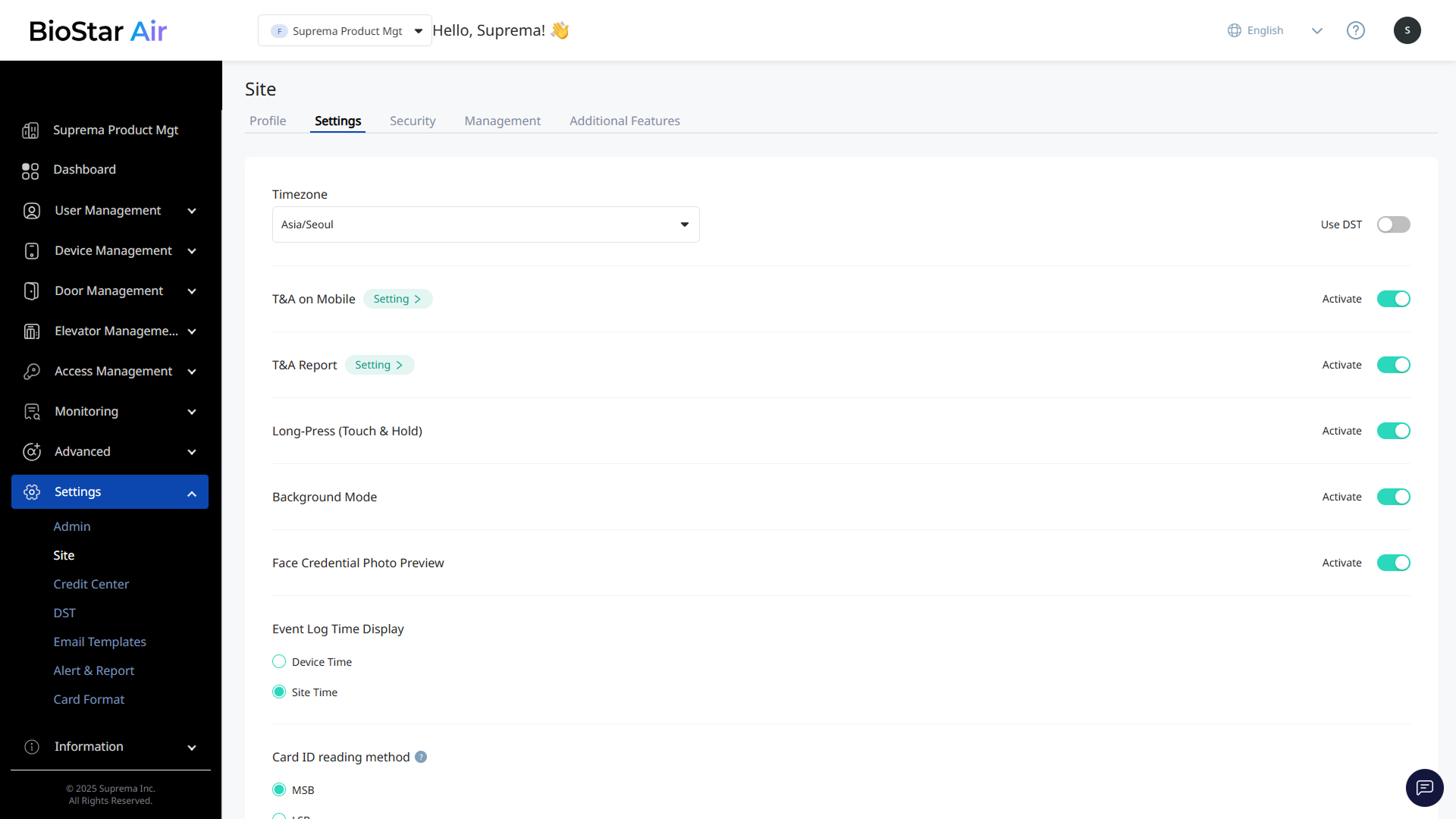 BioStar Air에서 사이트 설정을 관리하는 것은 효과적인 관리에 필수적입니다. 이 문서에서는 사용할 수 있는 설정과 구성 방법을 안내합니다.