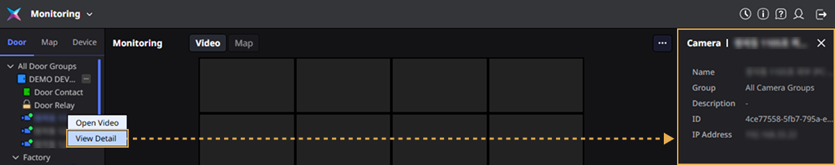 カメラ装置の映像をリアルタイムで確認するには、ポップアップメニューで ビデオを開く をクリックしてください。 モニタリング セクションのビデオタイルに選択したカメラの映像を追加して再生できます。