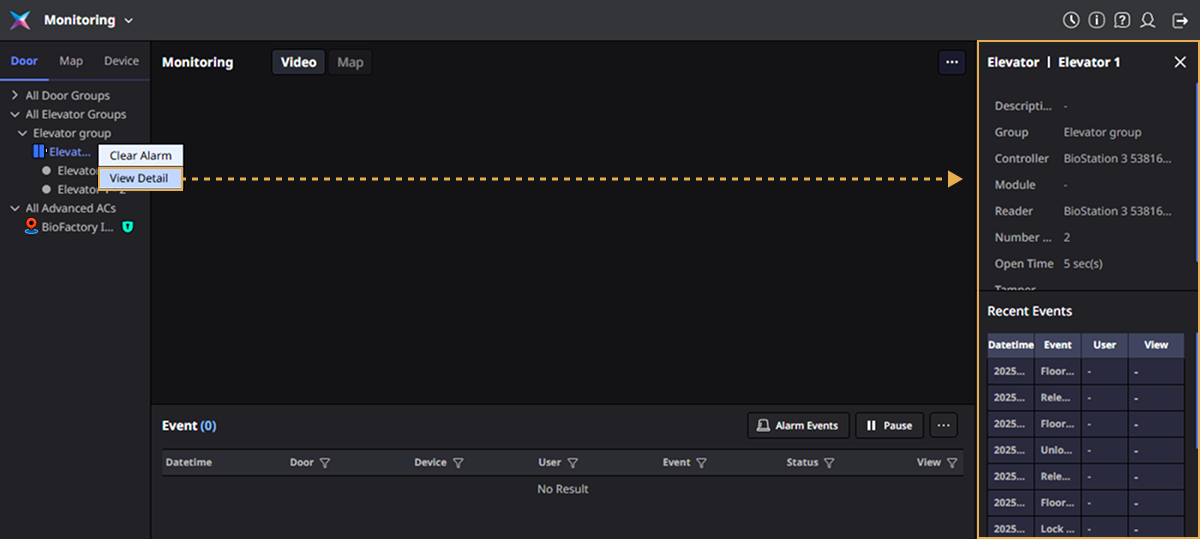 エレベーターの詳細情報とイベント履歴を確認できます。 ポップアップメニューで 詳細を表示 をクリックしてください。 画面右側にエレベーターの詳細情報とイベント履歴が表示されます。