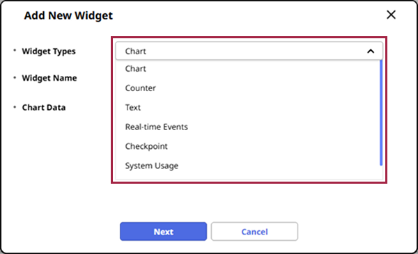新しいウィジェット 追加 ウィンドウが表示されたら、ウィジェット タイプ から希望の項目を選択し、必須項目を入力または設定します。