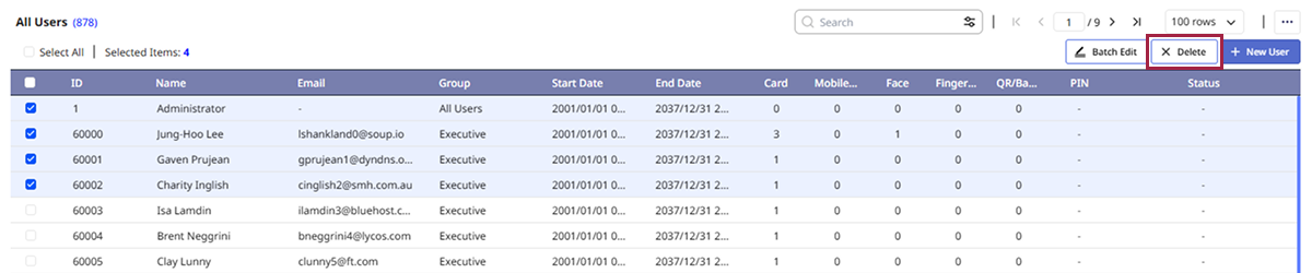 退職、契約終了、セキュリティ違反などの理由でBioStar Xに登録したユーザーを削除する場合は、次の手順に従って削除できます。