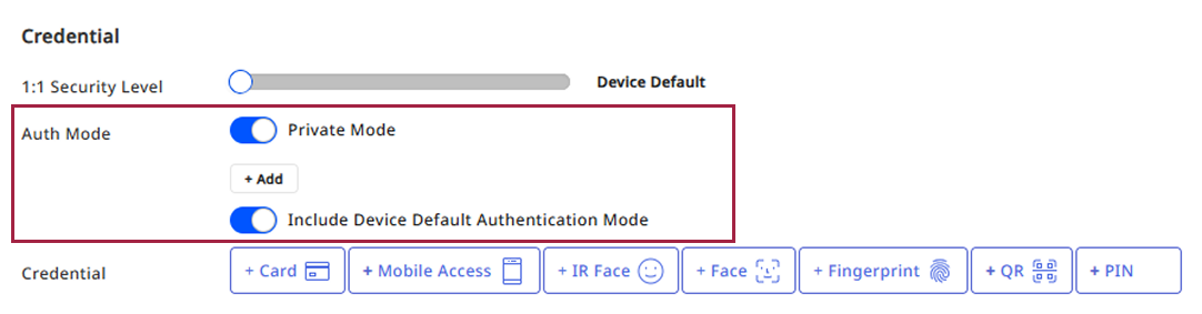端末の初期値の認証モードを含む に設定すると、デバイスで設定された認証モードと BioStar X で設定した個別認証モードの両方を使用できます。