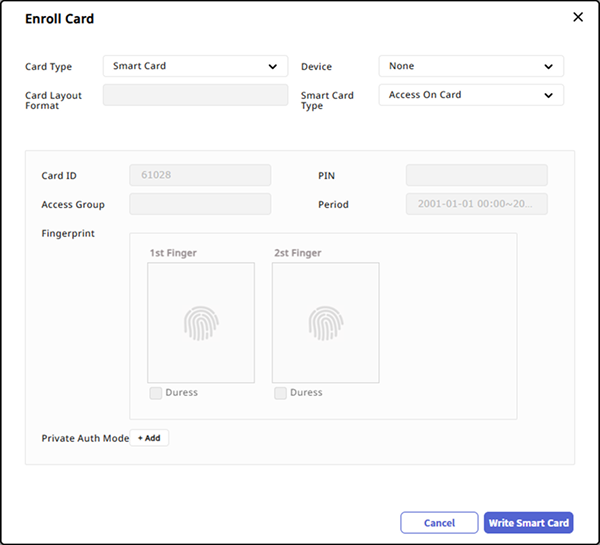 スマートカードに保存されるユーザー情報は BioStar X に保存された情報を使用します。 変更したユーザー情報を保存しない場合、スマートカードに誤ったユーザー情報が保存される可能性があります。 また、変更したユーザー情報をデバイスと同期しないと、デバイスが認証を実行できない場合があります。