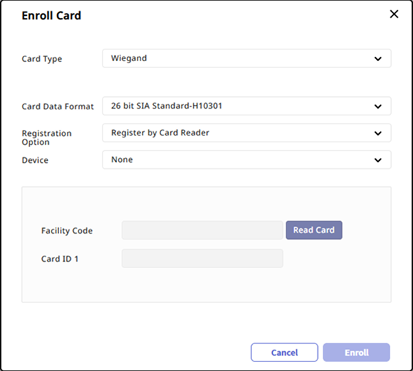 「カード登録」ウィンドウが表示されたら、カード種別 オプションで Wiegand を選択します。