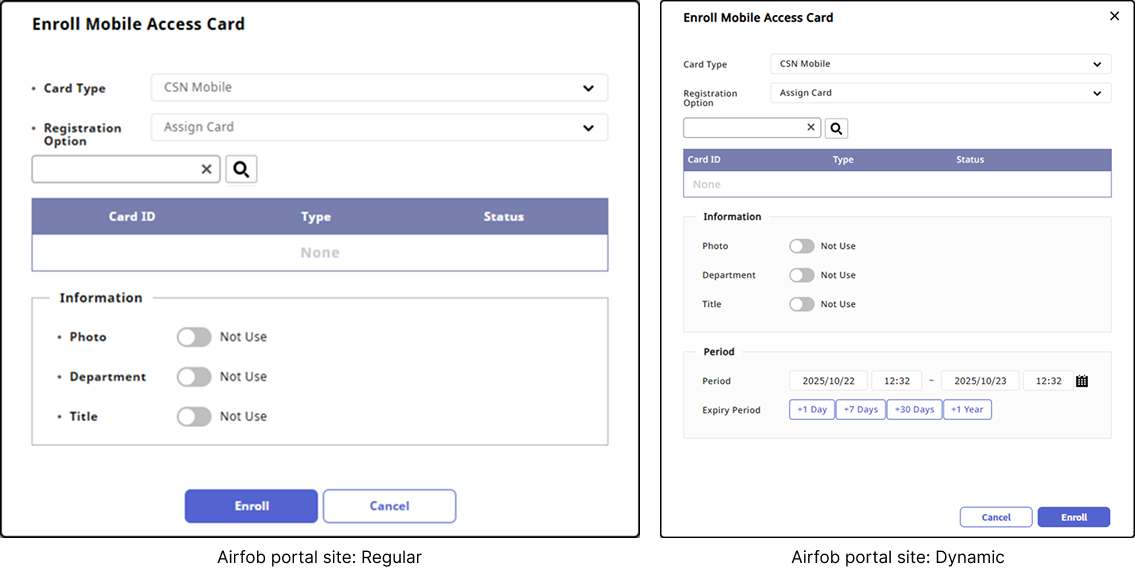 有効期限 項目は、Airfobポータルでサイトを作成する際にダイナミック(Dynamic)サイトとして設定すると有効になります。 ユーザーのモバイルアクセスカードの有効期限と利用期間を設定できます。 Airfobポータルの利用に関する詳細は次のリンクを参照してください。