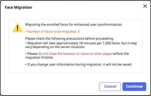 顔マイグレーションを実行します。 顔マイグレーションが完了すると、総顔数、成功件数および失敗件数を確認できるポップアップが表示されます。