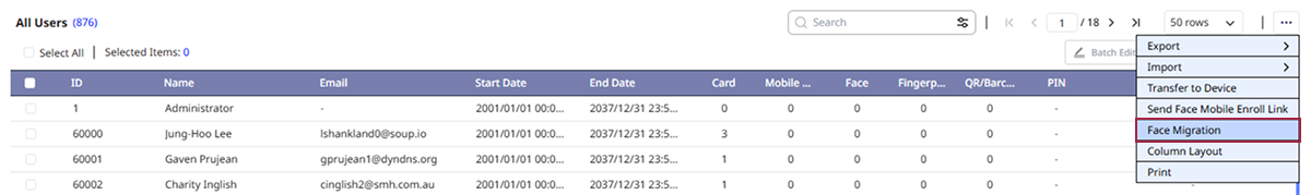 BioStar X サーバーにすでに保存されているユーザーの画像から 2 種類の顔テンプレートを生成する機能です。 ユーザー同期時に顔をテンプレートのみで同期するには、顔の移行 を実行する必要があります。