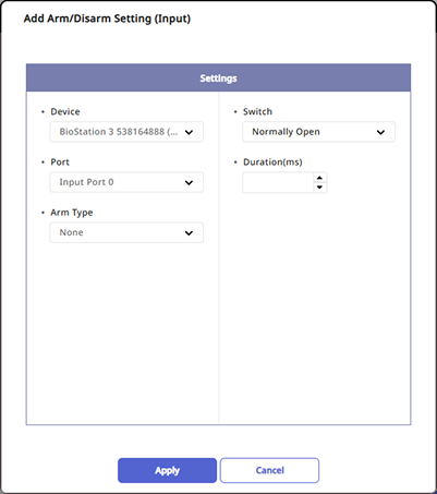 「警戒/解除設定」(入力)オプションで + 追加 をクリックします。 警備機能を制御するデバイスを選択します。 ポート をクリックし、選択したデバイスの入力ポートを選択します。