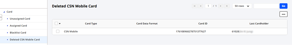 削除された CSN モバイルカードは 設定 → カード の 削除されたCSNモバイルカード リストに記録されます。 リストでは カード種別、カードデータ形式、カード ID、最後のカードホルダー を確認できます。