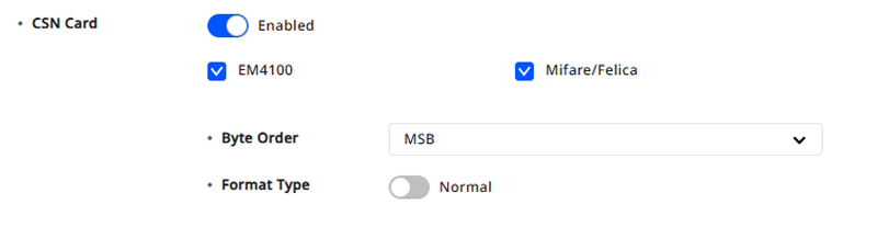 CSNカードとフォーマットの種類を選択し、バイト順序を設定します。