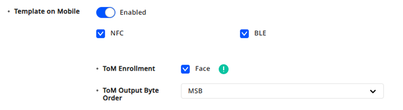 テンプレートオンモバイルの認識方法と、ユーザーがデバイスで直接登録するバイオメトリクスを指定し、バイト順序を設定します。