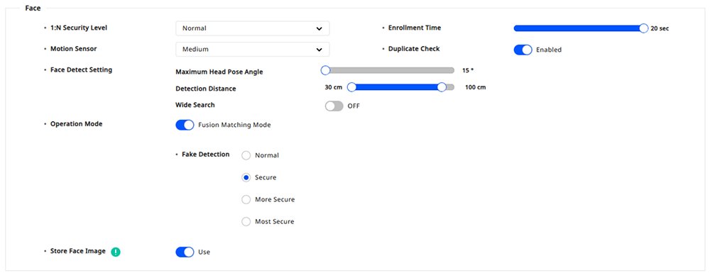 顔検知設定、動作モード の各オプションは FaceStation F2、BioStation 3 モデルでサポートされています。
