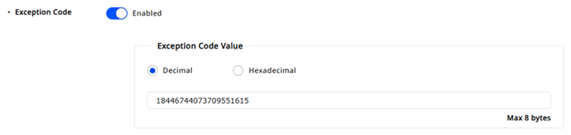 例外 コード:インテリジェントスレーブを使用する際に認証失敗などの例外が発生した場合、例外コードを10進数(0~18446744073709551615)または16進数(0~FFFFFFFFFFFFFFFF)形式で入力して正確なログを残せます。 16進数は数字または英字で入力できます。