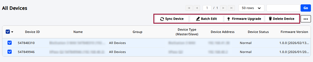 デバイス一覧で対象のデバイスのチェックボックスをクリックします。 1 台以上のデバイスを選択できます。