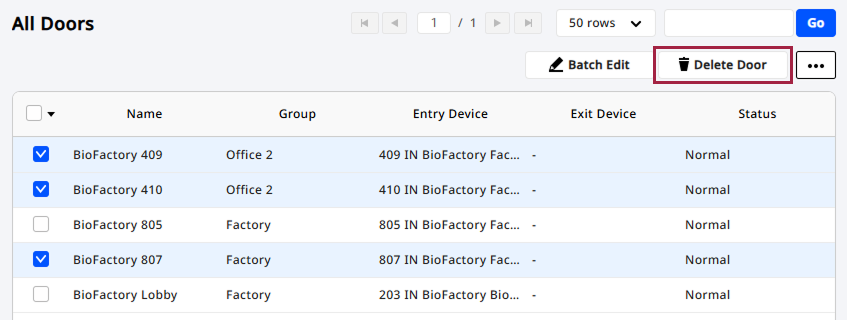 ドア一覧で1つ以上のドアを選択すると、ドアの削除 ボタンが有効になります。