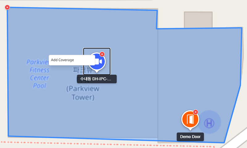 マップでカメラの撮影範囲を設定できます。 カメラが配置されたアイコンを右クリックし、カバレッジを追加する を選択します。