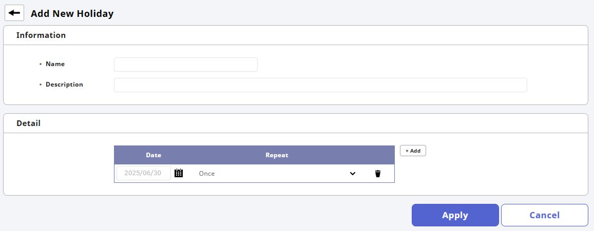 未設定 セレクトボックスで、事前に設定した休日を選択できます。 休日を追加するには + 追加 をクリックし、休日を設定します。