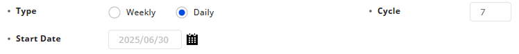 種別:週単位または日単位のスケジュールを選択します。 日 を選択すると、周期 と 開始日 を選択できます。