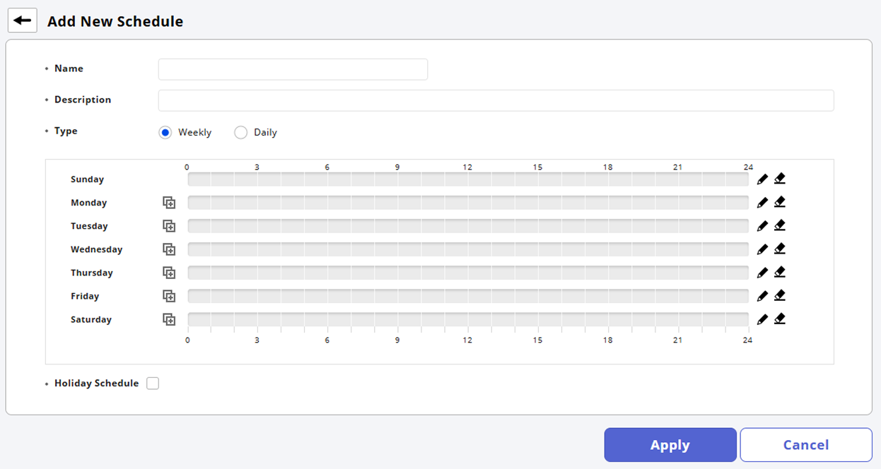 入退室および休日スケジュールを設定し、アクセス制御と勤怠管理を効率的に運用する方法を案内します。 スケジュールはアクセス制御に適用できる重要な要素で、ユーザーの入退室時間と休日を管理できます。