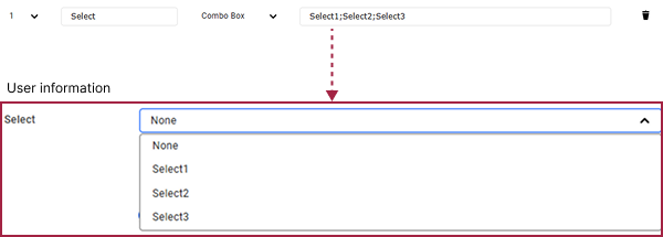 コンボボックス:最大20個のサブ項目を32文字で追加でき、各項目はセミコロン(;)で区切ります。 (例:選択1;選択2;選択3)