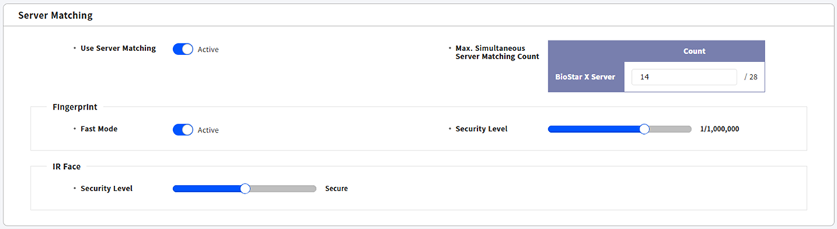セキュリティレベル:指紋に対するサーバーマッチングのセキュリティレベルを設定できます。 セキュリティレベルが高いほど本人拒否率(FRR)が増加します。