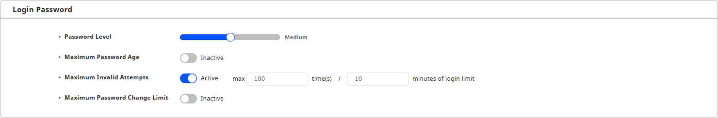 ログイン パスワード セクションでは、ログインパスワードに関するセキュリティレベルを設定します。 組織のセキュリティ要件に合わせてパスワードポリシーを設定します。