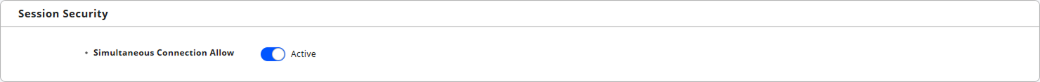 セッションセキュリティ セクションでは、セキュリティを強化するために同一アカウントの重複ログインを制限できます。 同時接続 オプションを 無効 に設定してください。 同一アカウントで同時接続が試行されると、既に接続しているユーザーはログアウトされます。