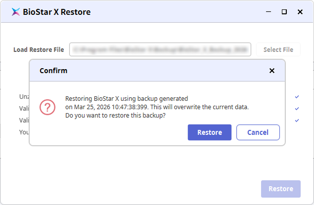 復元中にPCが異常終了した場合は、BioStar X Restore を再実行して復元を再試行してください。