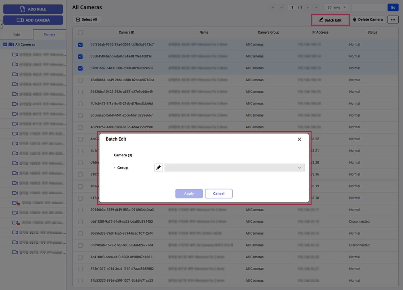 一覧で削除するカメラの左端にあるチェックボックスをクリックします。 1台以上のカメラを選択できます。