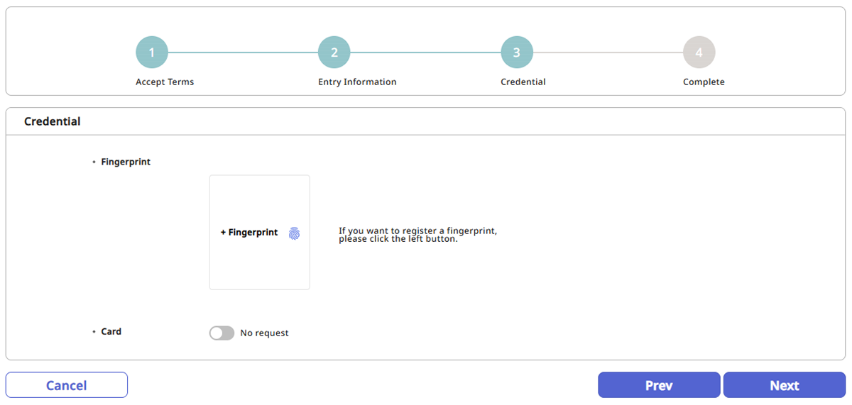 指紋:指紋認証を使用する場合は + 指紋 ボタンをクリックして指紋を登録してください。