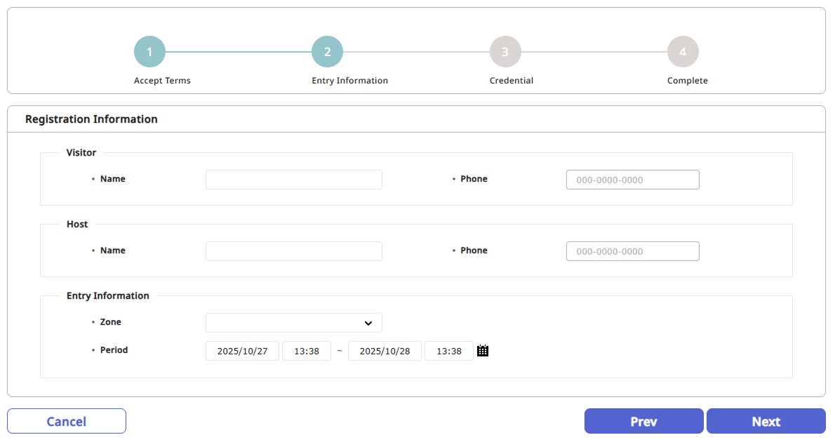 ログイン情報:入退室エリアと訪問期間を設定してください。