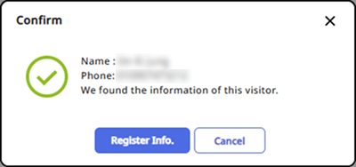 指紋と一致する来訪者が検索されると、確認メッセージが表示されます。 登録情報 をクリックします。