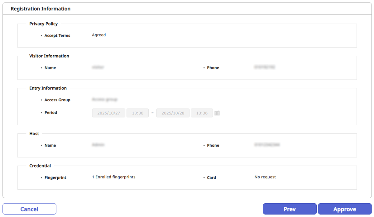 登録情報 の内容を確認し、来訪を承認するには、画面右下の 承認 をクリックします。