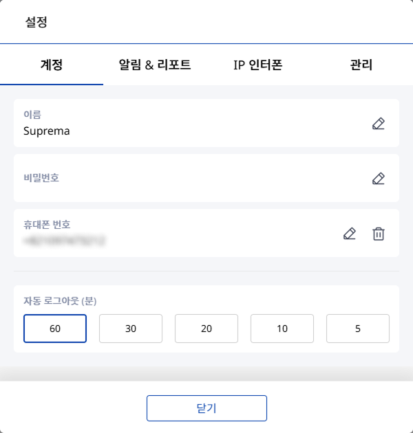자동 로그아웃 (분): 선택한 시간이 지나면 자동으로 로그아웃됩니다. 원하는 시간을 선택하세요.