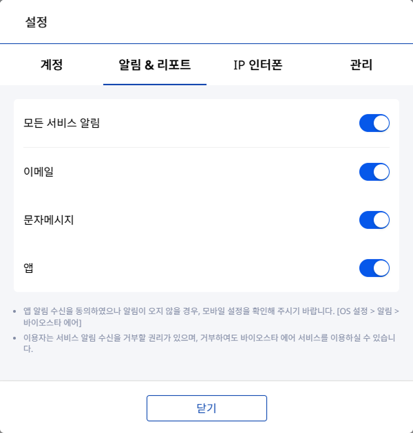 알림 & 리포트 탭에서는 알림 수신 방식을 설정할 수 있습니다. 모든 알림을 수신하려면 모든 서비스 알림 옵션을 활성화하세요. 원치 않는 알림은 개별적으로 비활성화할 수 있습니다.
