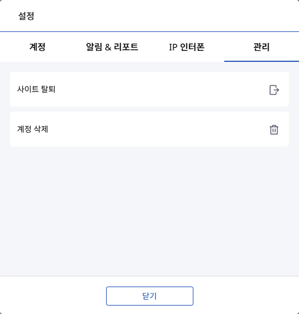 관리 탭에서는 사이트를 탈퇴하거나 계정을 삭제할 수 있습니다.