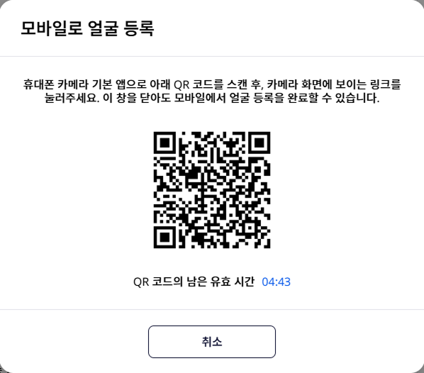 모바일로 등록: 모바일 기기의 카메라로 QR 코드를 스캔하면 얼굴 이미지를 등록할 수 있는 링크로 이동할 수 있습니다.