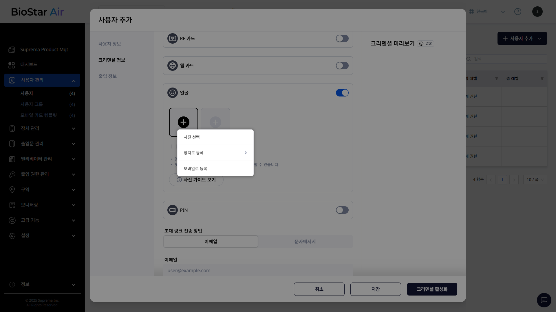 얼굴: 출입 인증 수단으로 얼굴 프로필 이미지를 최대 2개까지 추가할 수 있습니다. 기존 이미지를 업로드하거나 리더를 통해 등록할 수 있습니다. 또는 이메일로 링크를 보내서 사용자가 모바일 기기의 카메라를 사용해 직접 등록하는 방법도 있습니다.