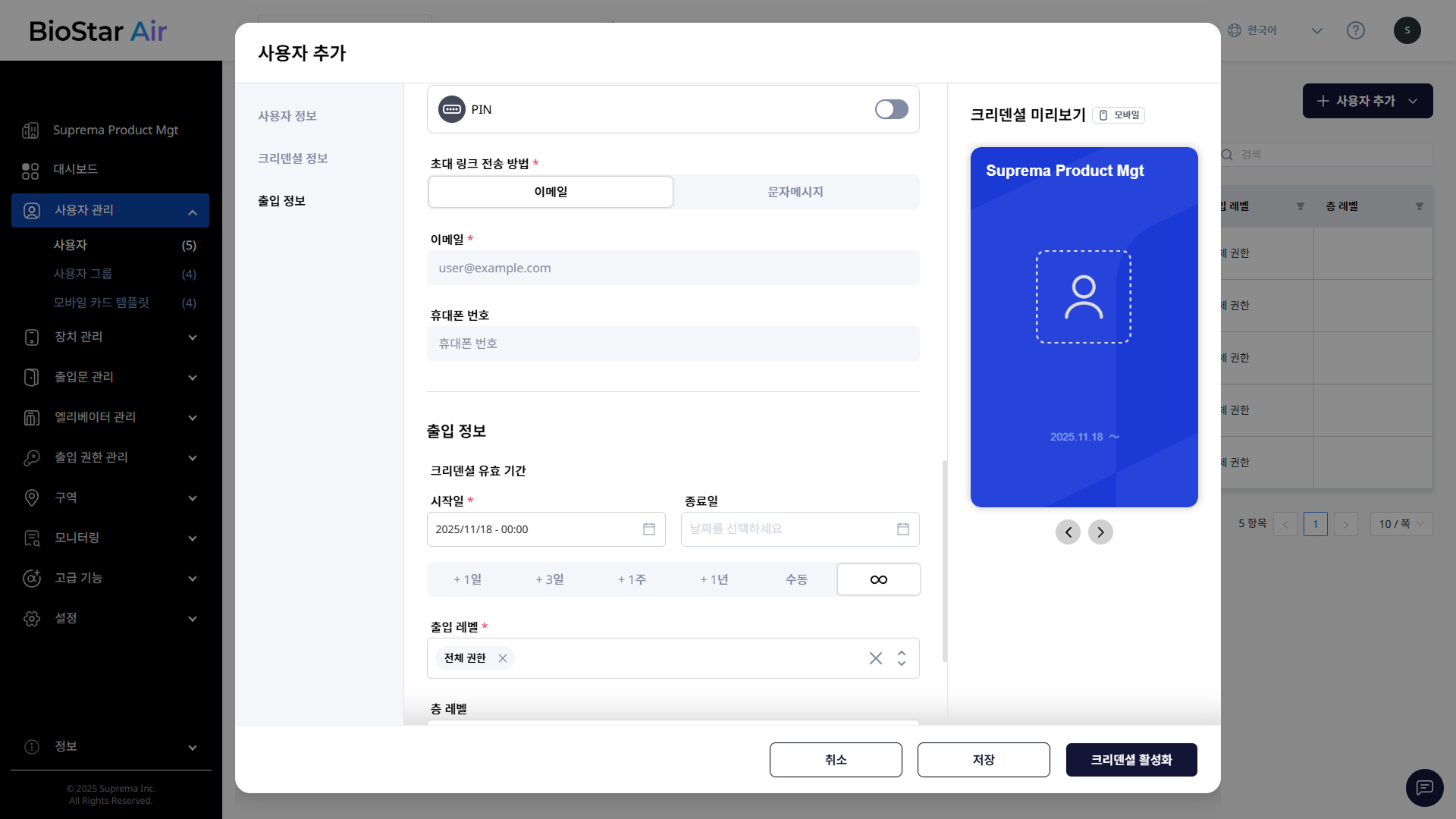 크리덴셜을 선택한 후 출입 정보 섹션에서 사용자의 크리덴셜 유효 기간, 출입 레벨 및 층 레벨 등을 구성하세요.