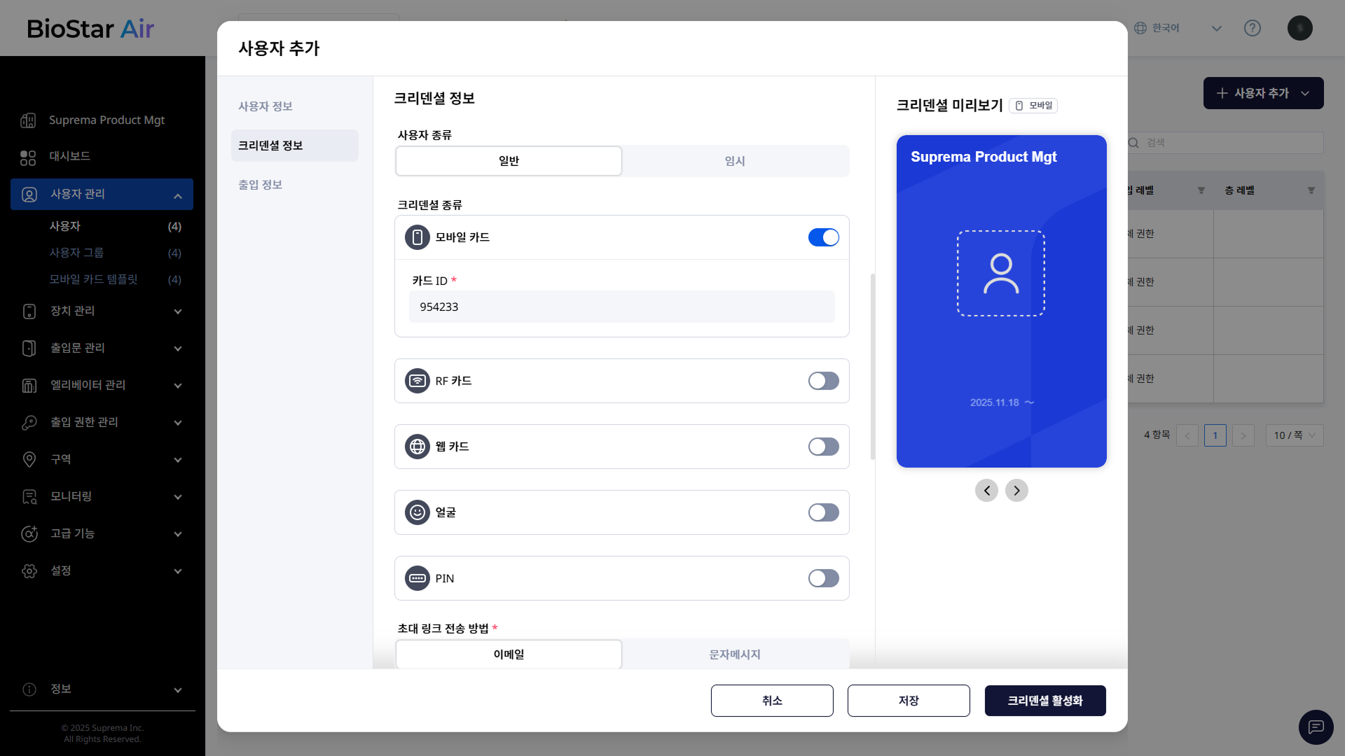 모바일 카드: 슈프리마 패스 모바일 앱을 출입 인증 수단으로 사용할 수 있습니다. 관리자는 카드 ID 번호를 편집할 수 있습니다.