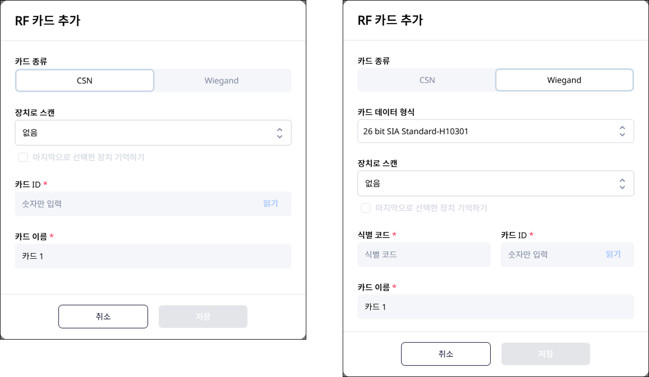 카드 종류(CSN / Wiegand), 카드 ID 및 카드 이름을 구성할 수 있습니다. 장치로 스캔 항목에서 리더기를 선택하세요. 연결된 리더기를 사용하여 실물 RFID 카드를 스캔할 수도 있습니다.