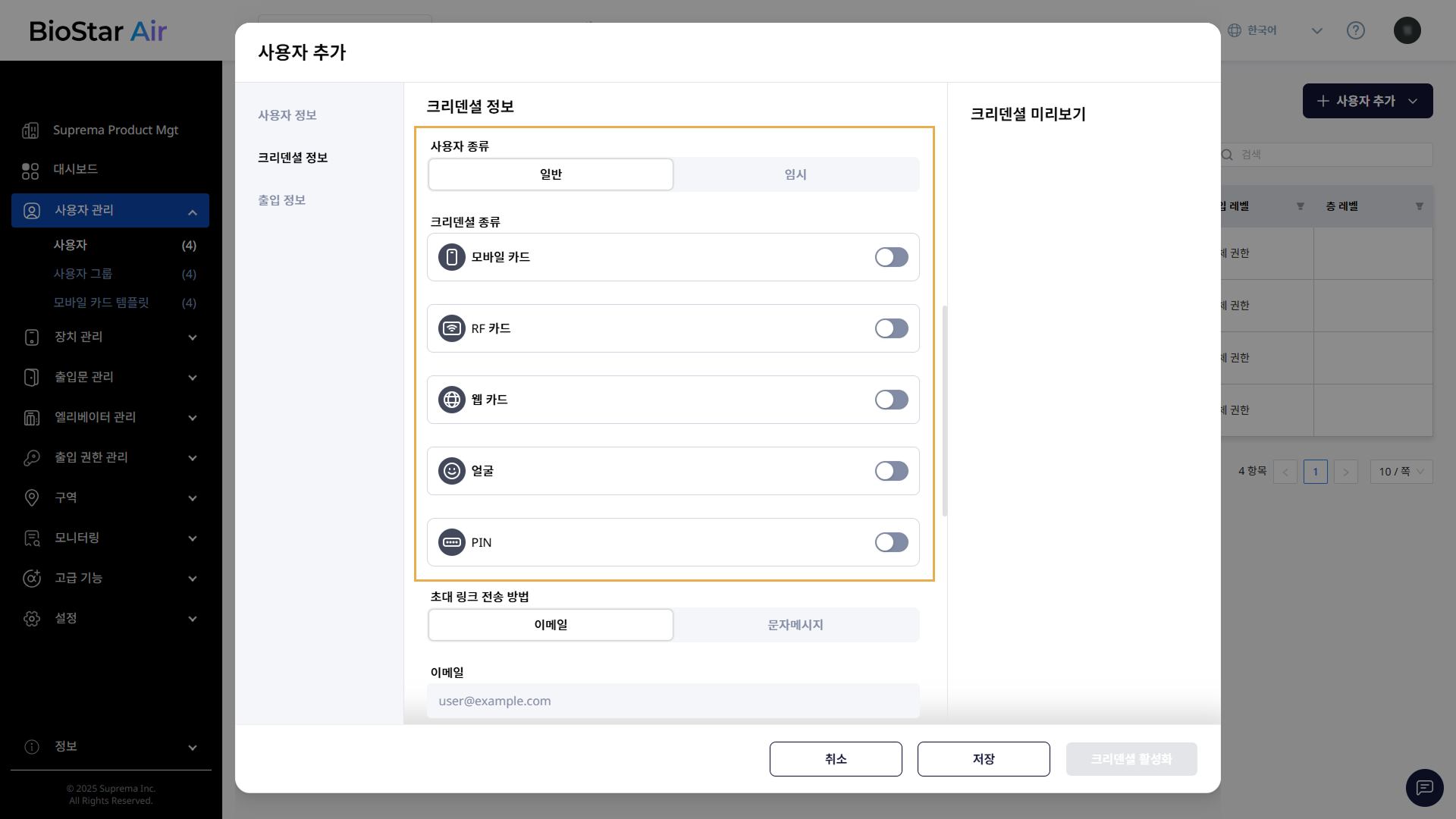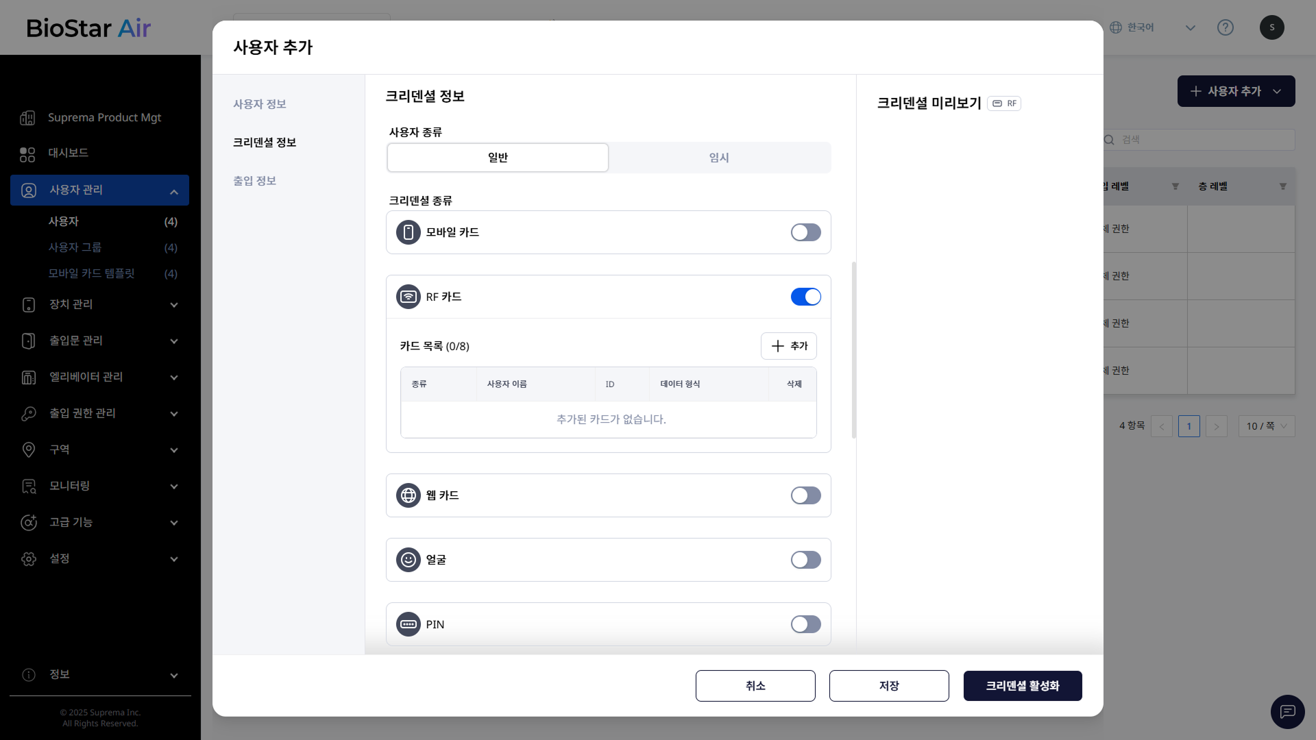 사용자 정보를 입력한 후, 크리덴셜 정보 섹션에서 출입 인증 수단으로 사용할 크리덴셜을 설정하세요. 각 크리덴셜에는 활성화 또는 비활성화할 수 있는 토글 스위치가 있습니다.