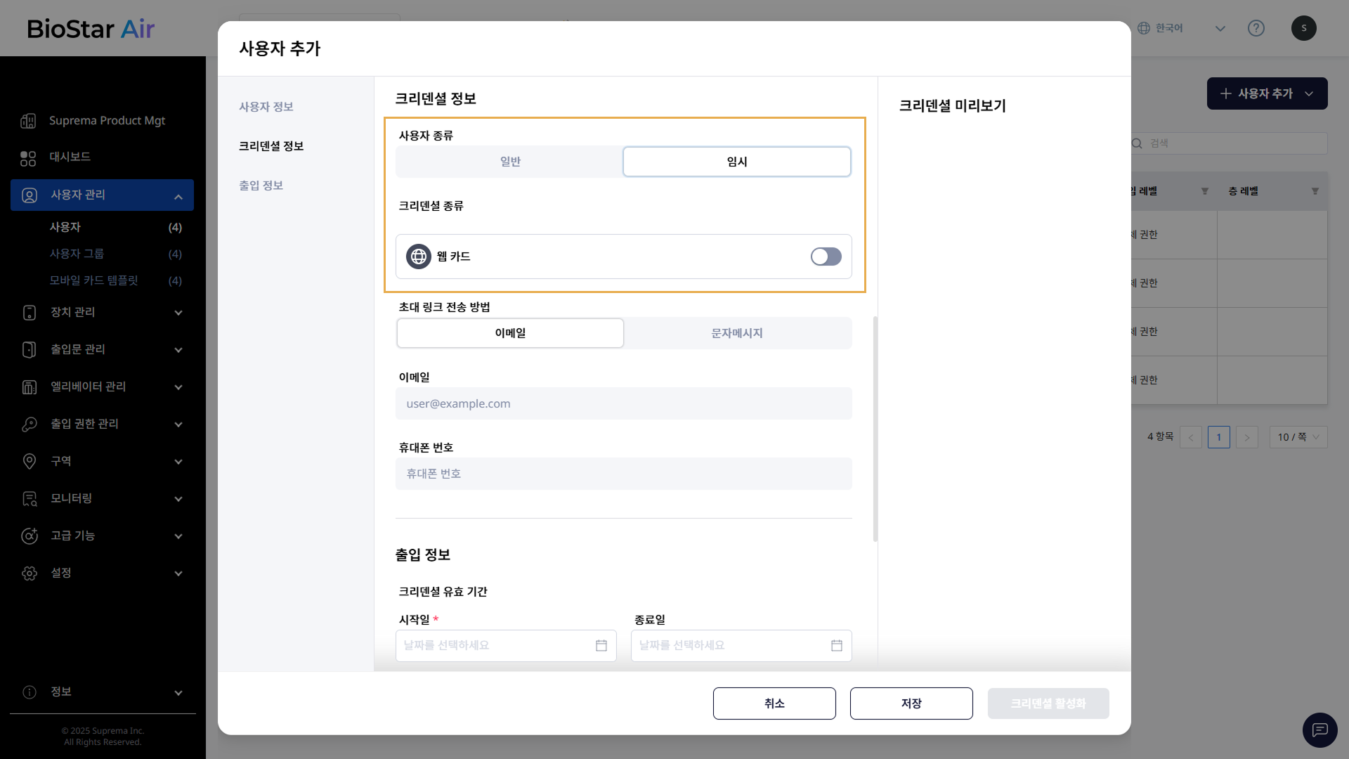 사용자의 이메일과 전화번호는 크리덴셜 정보 섹션의 초대 링크 전송 방법 항목에서 입력할 수 있습니다.