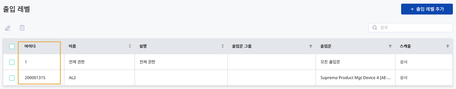 출입 레벨 IDs : 출입 권한 관리 → 출입 레벨에서 출입 레벨 아이디를 확인할 수 있습니다. 전체 권한은 항상 1로 설정됩니다. 쉼표(